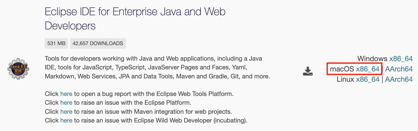 Eclipse IDE for Enterprise Java and Web Developers 의 x86_64 를 클릭 하여 다운로드 받는다.