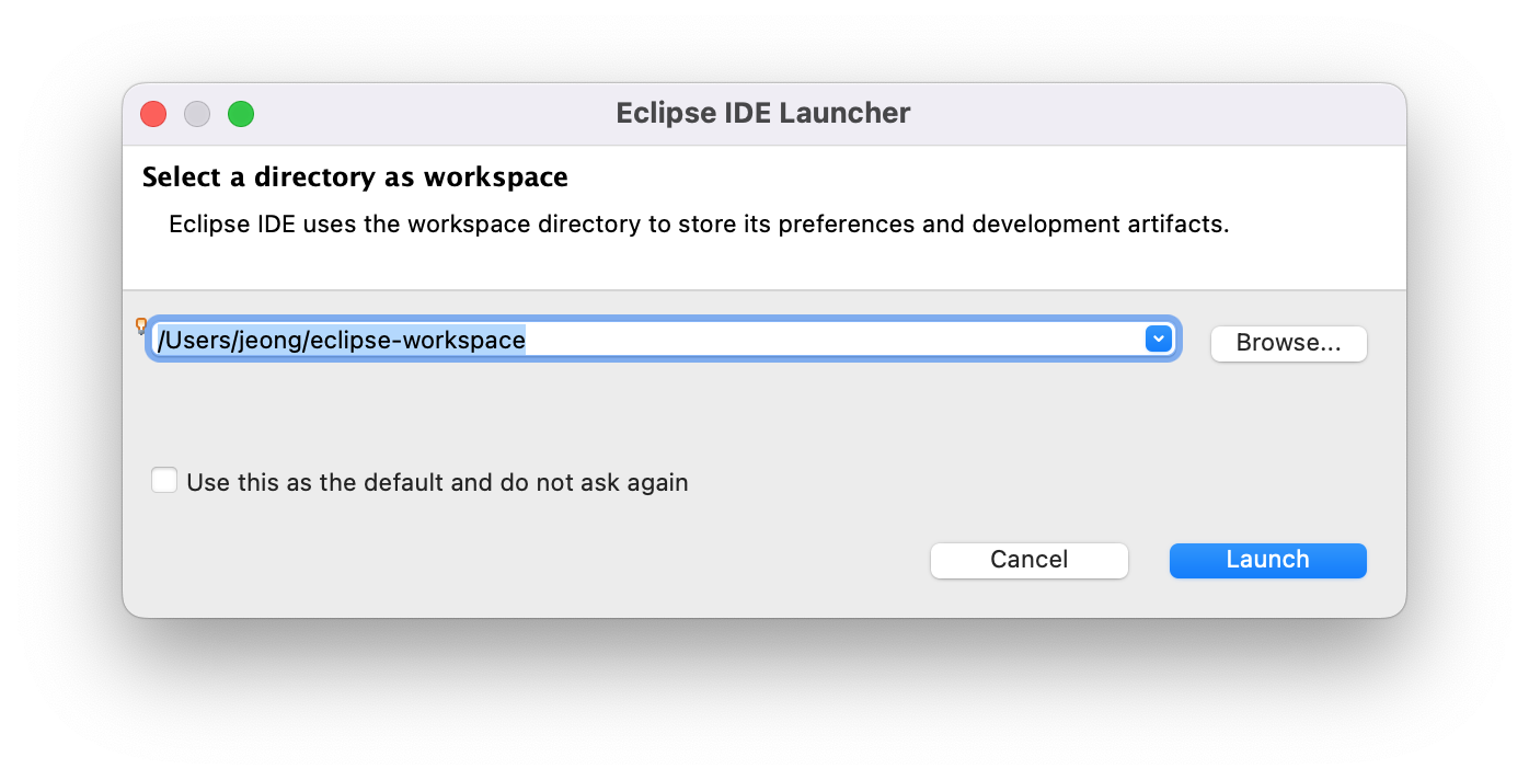 workspace 디렉토리를 적당한 경로로 설정한후 "Launch" 버튼을 클릭 하면