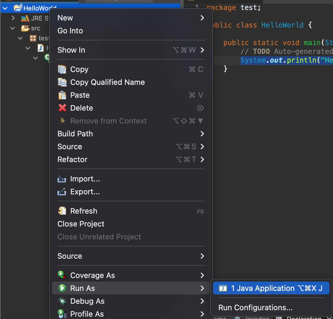 HelloWorld 프로젝트의 마우스 우클릭 -> Run As -> Java Application 을 클릭 한다.