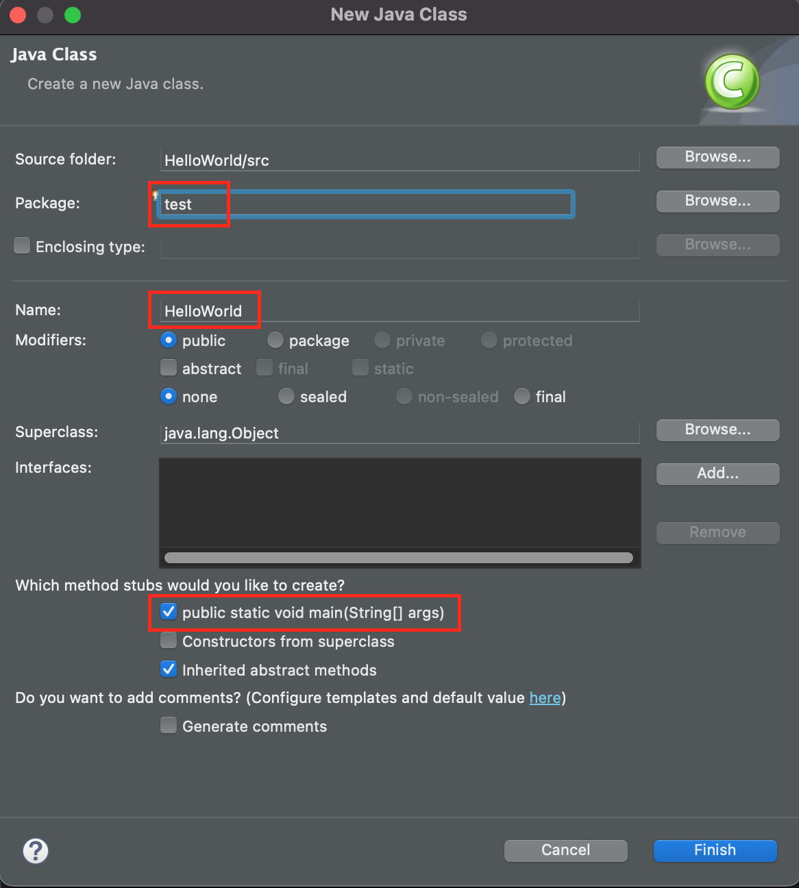 마지막으로 "public static void main(String[] args)" 를 체크 한후 "Finish" 버튼을 클린한다.