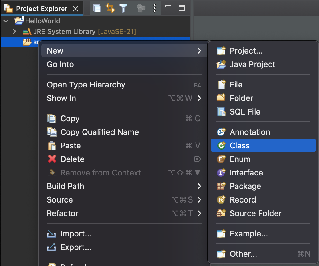 "src" 폴더에서 마우스 우클릭 하여 "New" -> "Class" 를 클릭 한다.