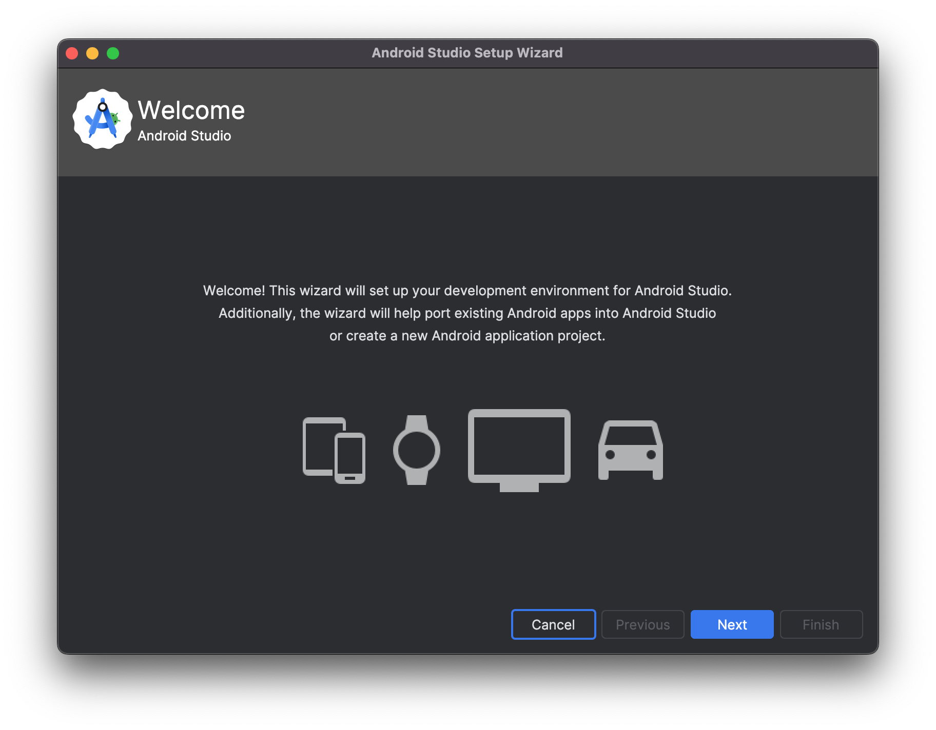 이제 설치된 "Android Studio" 를 더블 클릭 하여 실행 하면, 안드로이드 스투디오가 실행 됩니다.
