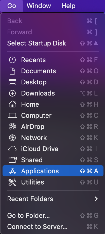 그러면 "Go" -> "Application" 을 선택 하여 창을 열어보면