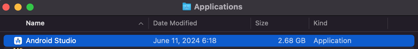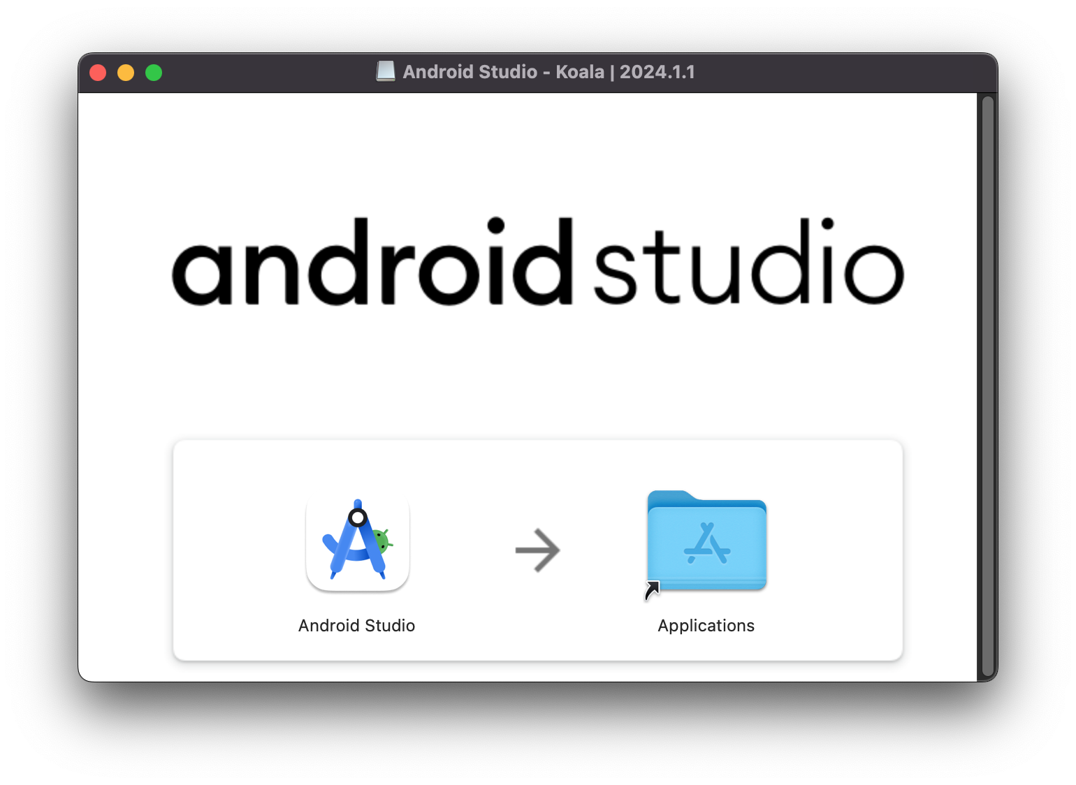 설치를 위해서 아래와 같은 화면에서 "Android Studio" 를 마우스 좌클릭 하여 누른 상태로 Drag&Drop 으로 "Application" 으로